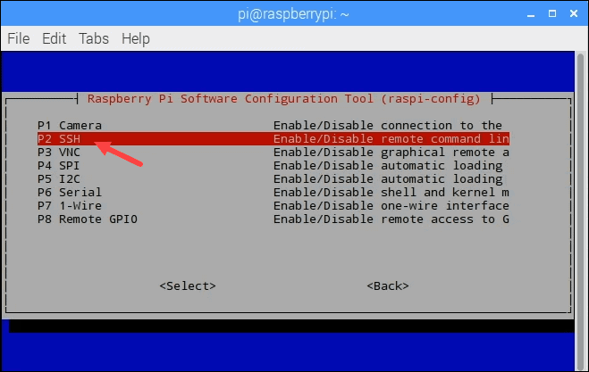Ahora, elija «SSH» (la opción P2) para activar el ingreso a la línea de comandos recóndita mediante SSH.